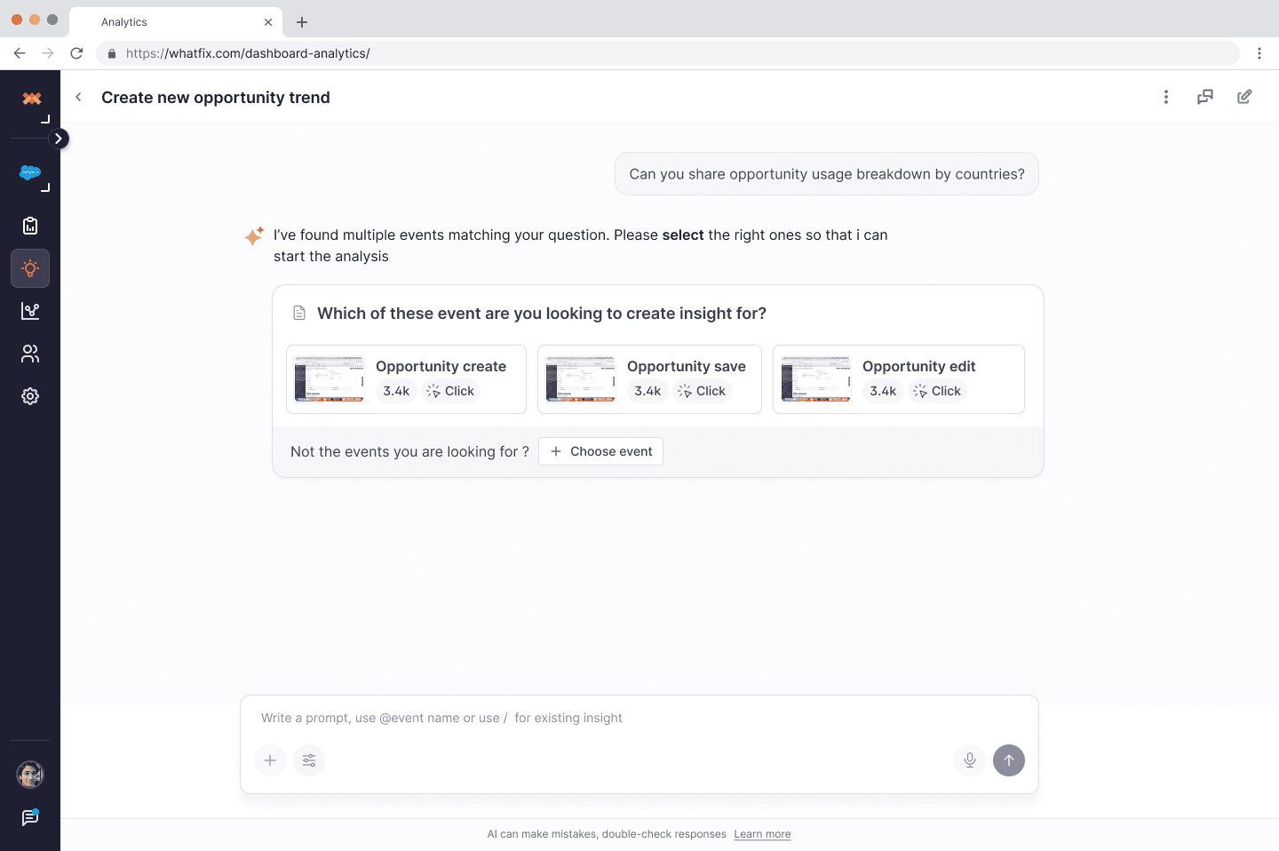 Added visual controls to adjust date ranges, swap event types, add/remove filters, and switch chart types—without retyping questions.