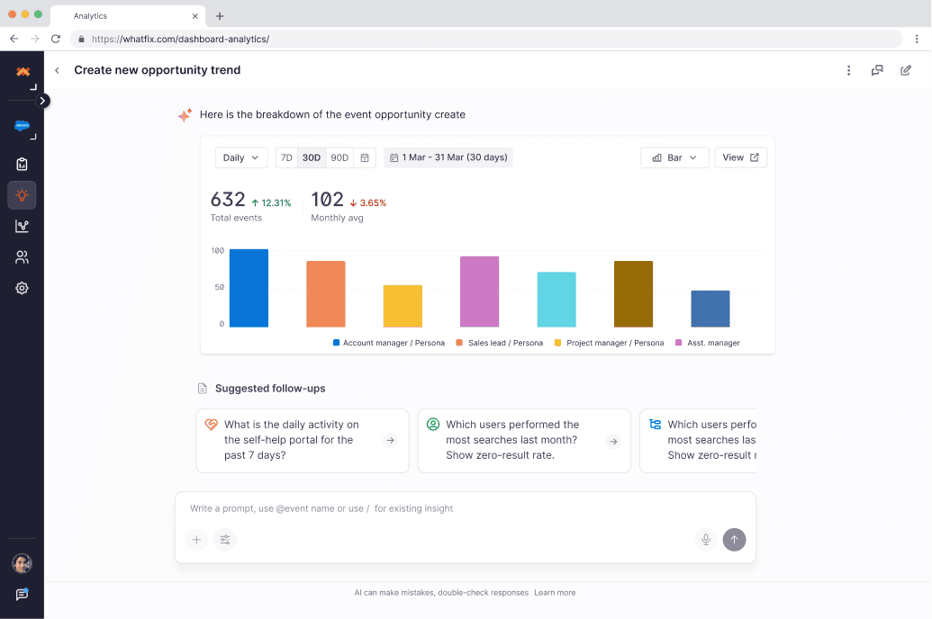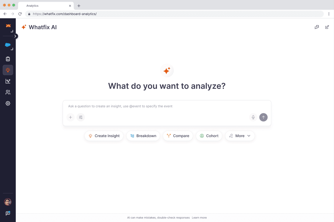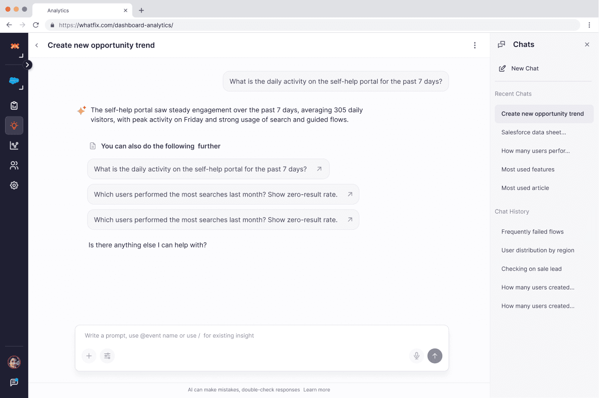 Ask Whatfix AI is an AI-powered analytics feature that converts natural-language questions into data visualizations (Trend, Funnel, User Journey charts) without manual event setup. I led the redesign to transform it from a beta feature with low retention into a trusted analytics partner.