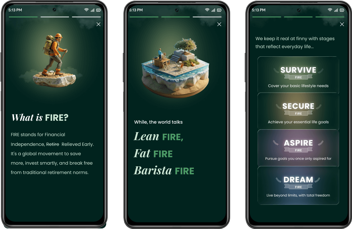 Reframed FIRE into relatable life stages (Survive → Secure → Aspire → Dream)